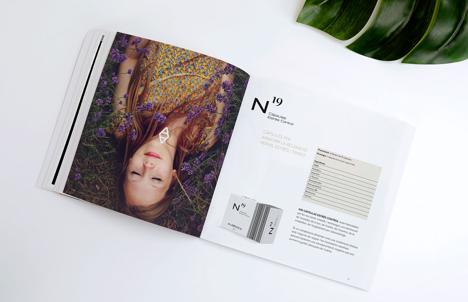 Diseño y maquetación del catálogo de productos Algēmica. Es un catálogo dedicado exclusivamente a los profesionales que comercializan la marca Algēmica. Una importante herramienta para explicar al consumidor, las características de los productos Algēmica y también es un manual de consulta y formación para los profesionales, ya que incluye características técnicas sobre los ingredientes y la composición de los productos. Por este motivo es un catálogo comercial y, a la vez, un manual de consulta y herramienta de formación para el personal.